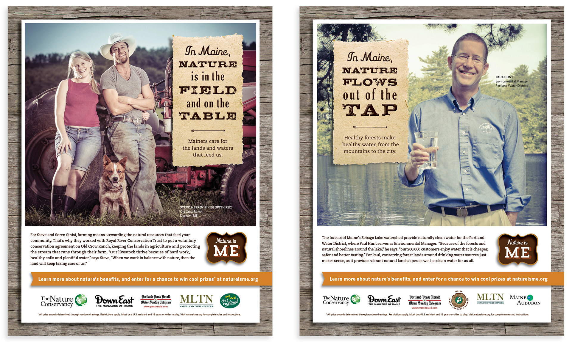 THE CHALLENGE: The Nature Conservancy in Maine wanted to promote a new campaign called "Nature is ME" to encourage statewide awareness about the environment and The Nature Conservancy in Maine. The campaign needed a logo, print ads, and a special newspaper insert. The materials should feel vibrant and current, use client palette, and include lots of natural textures and layers and type styles.